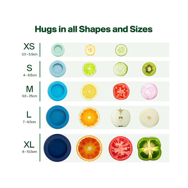 Food Huggers help keep your fruits and vegetables fresh. Our set of 5 includes all 5 sizes of Food Huggers: Mini, S, M, L, XL. They are also great for covering jars, opened cans, and other small containers. They nest compactly for space-saving storage and organization. Getting the most out of your fresh produce is health-smart, cash-smart, and good for the planet.