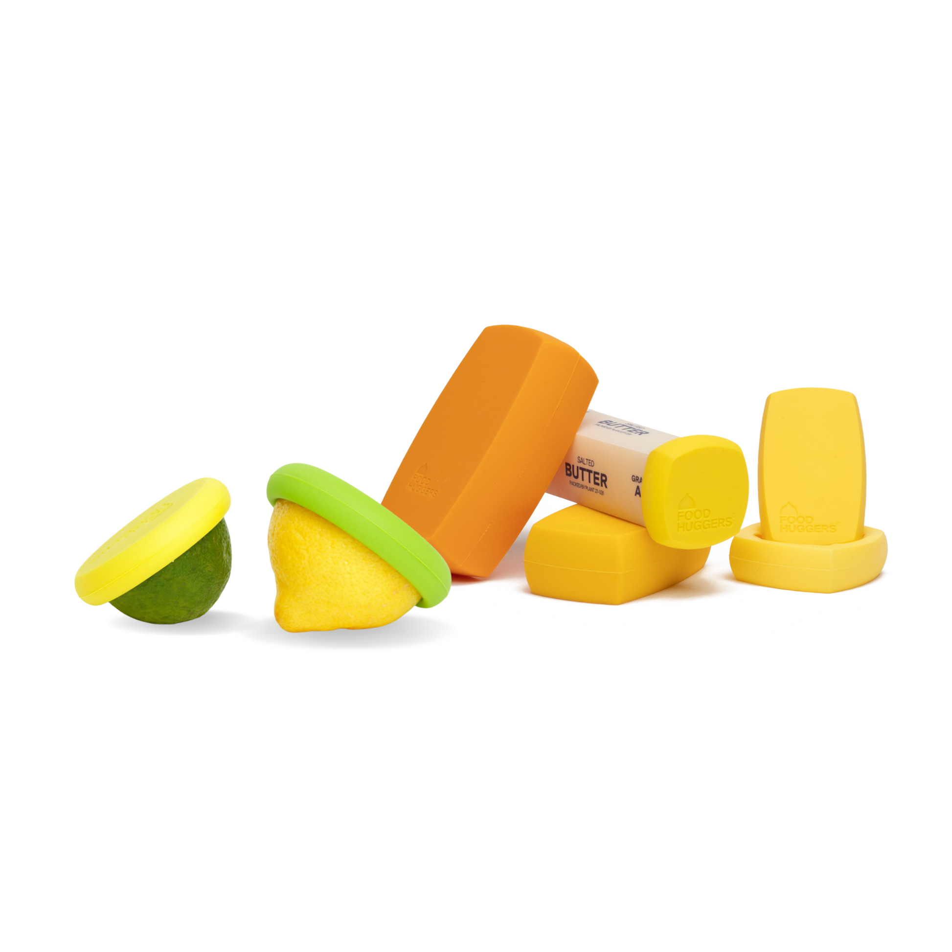 - Food Huggers: A set of two snug, reusable covers in a variety of sizes, designed to fit your fruits and vegetables, as well as jars and cans. These durable huggers create an airtight seal to lock in freshness and flavor.